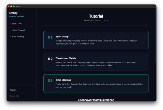 For those unfamiliar with the Eisenhower matrix, I’ve included a tutorial and reference in “Tutorial” located in the bottom left hand corner. It’ll summarize what this methodology means.