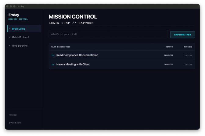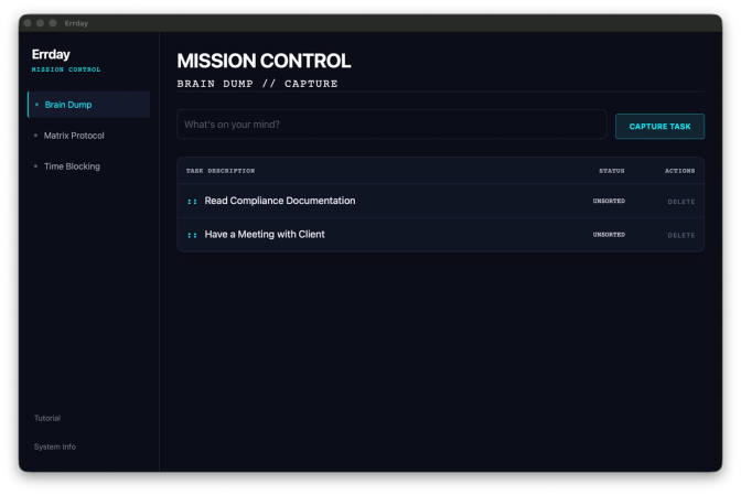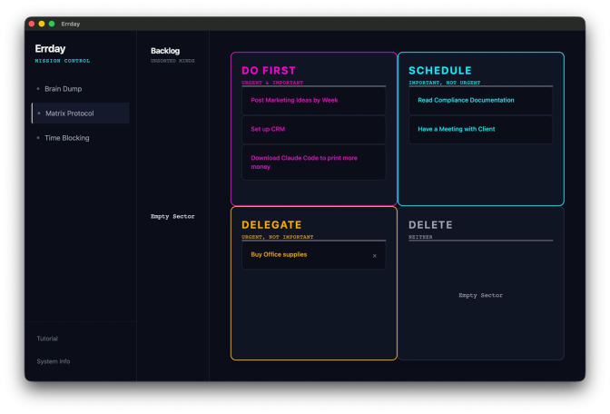 The app was made for users to complete 2-3 steps. The first step was to brainstorm all of your ideas and collect your thoughts in the home page of Errday. Then, you click “Matrix Protocol” to see the Eisenhower Matrix in action.