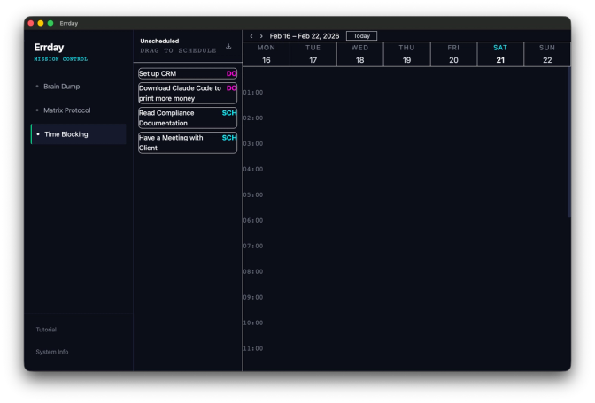 Click calendar to see your tasks (only priority) ready to be dragged and dropped into the weekly calendar view so you can time block your life. You can export your final schedule into the .ics file and import to Apple Calender, Google Calendar, Outlook and more.